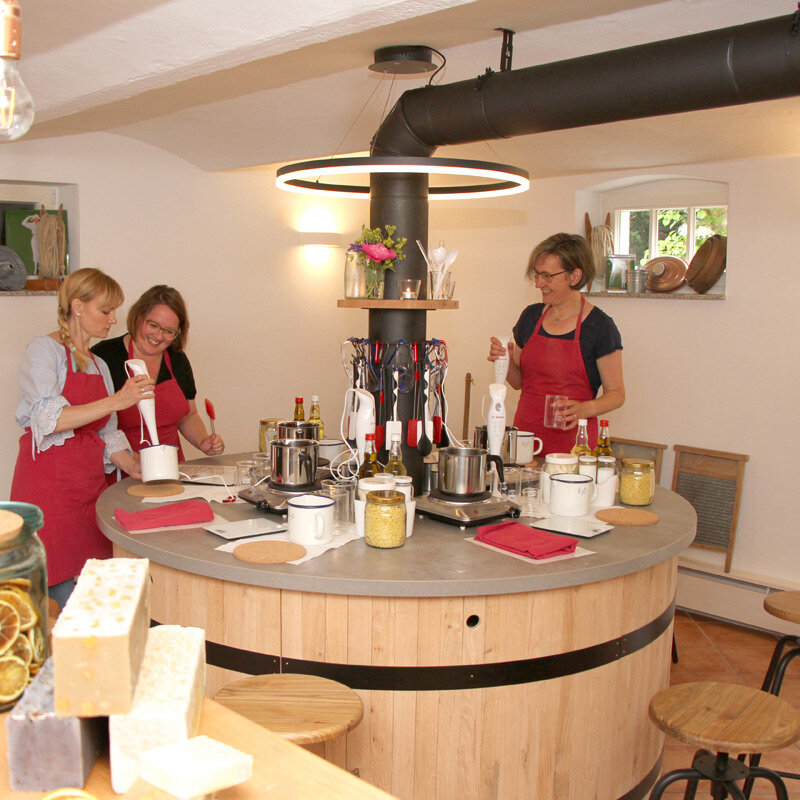 Im extra dafür hergerichteten "Waschhaus" werden Ihnen Grundkenntnisse der Seifenherstellung vermittelt und Sie erfahren etwas über die Historie der Seife, mögliche Zutaten wie Öle, Farbstoffe, Duftstoffe, Kräuter und über alle wichtigen Vorsichtsmaßnahmen bei der Herstellung.