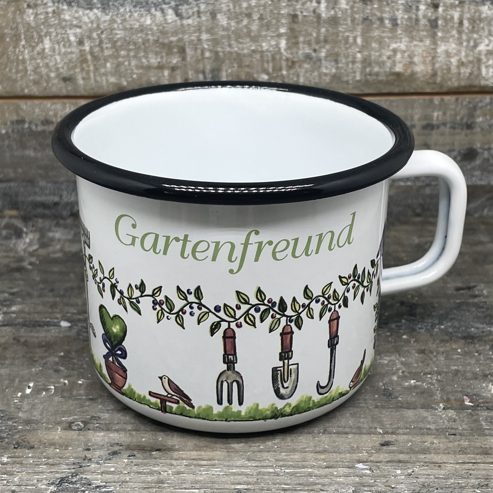 Emaille-Tasse "Gartenfreundin"