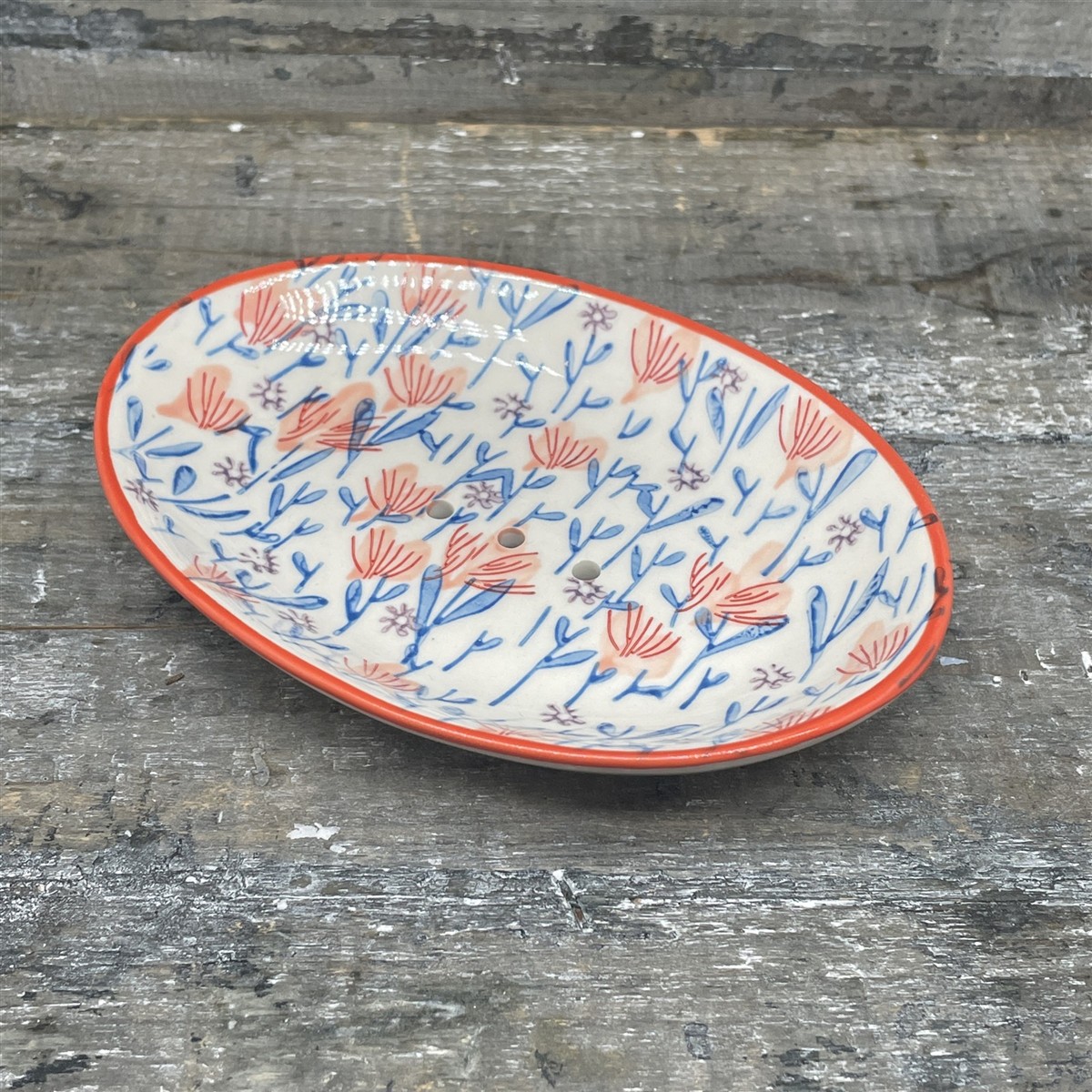 Jedes Seifenstück braucht seinen Platz auf dem Waschbecken.Diese Seifenschale hat ein zartes florales Muster und die Ablauflöcher in der Mitte sorgen dafür, dass Deine Seife nach dem Gebrauch gut abtrocknen kann.. Matrial: Steinzeug Maße: 13,5 x 9,5 x 2 cm