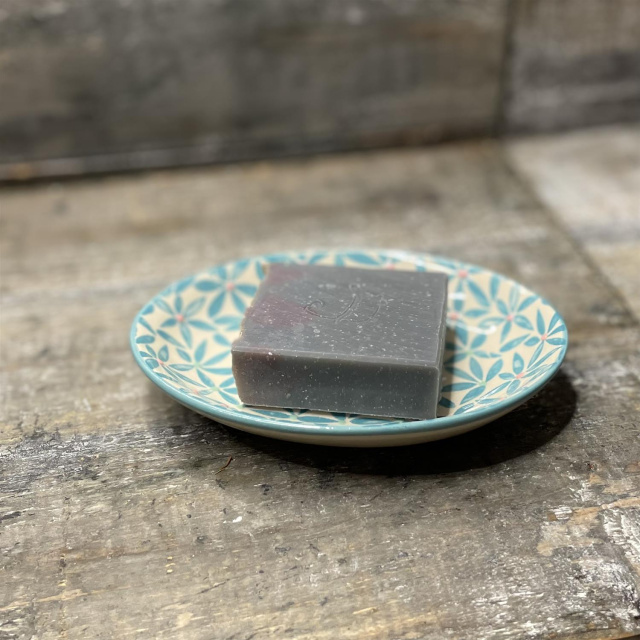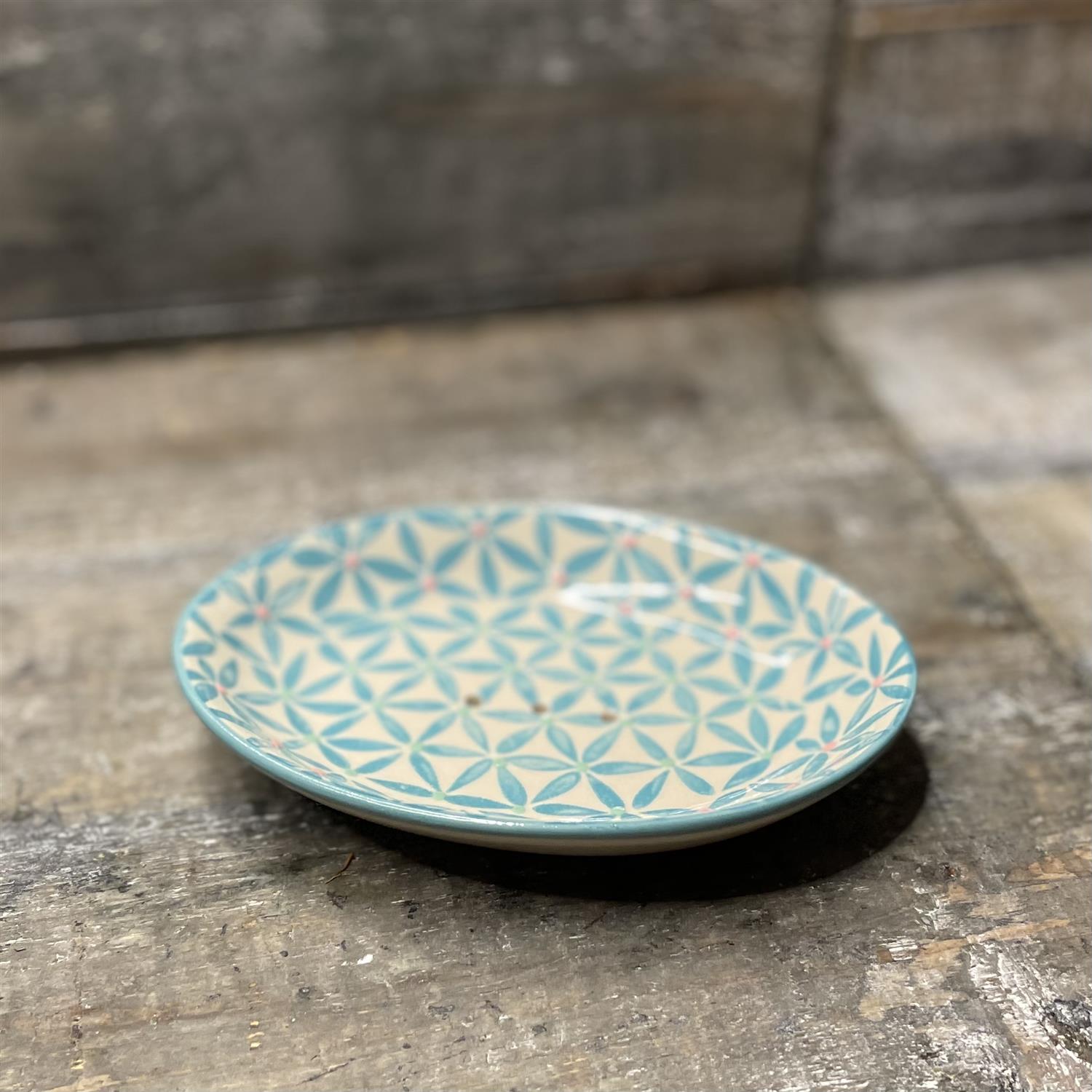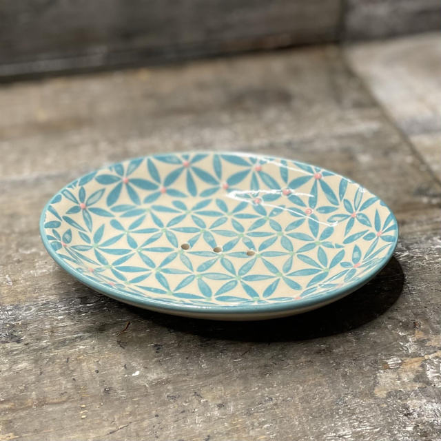Seifenschale RETRO mit türkisfarbenem Muster, Steinzeug, oval mit Ablauflöchern. Maße: 14 x 9,5 x 2 cm